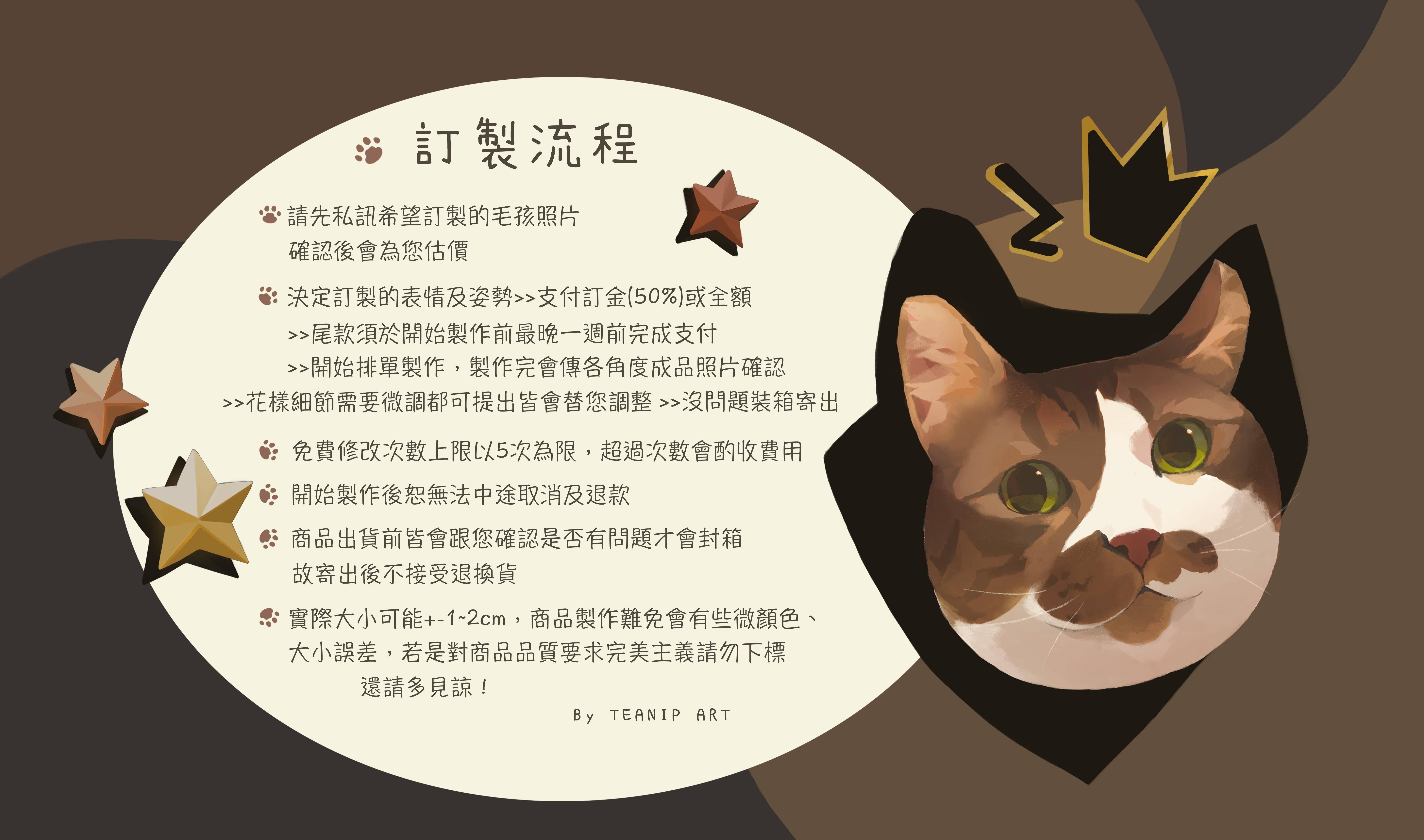 ◌ 都會為每個毛孩臉型體態量身訂做,所以進入製作過程後指定的表情及姿勢就無法再做變更。